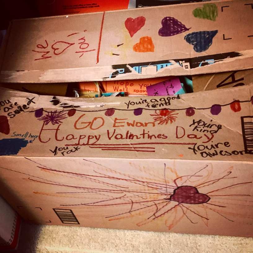 Him being gone today is beyond bitter and painful. He loved passing out Valentine’s Day cards. In the early days after his death, I learned to avoid cleaning when I accidentally Windexed away some of his handprints on a window. Agony. I’d give anything to have that dirty window back. Seldom used cabinets and bottom drawers became landmines. They explode with grief inside me from an artifact or memory I’d uncover. So, I typically stay in safe, well-worn rooms. Well, today, of all days, with head down and thoughts lost, while looking for heavy card stock paper, in the office I lifted up a book and, BOOM! Found this box from exactly a year ago…