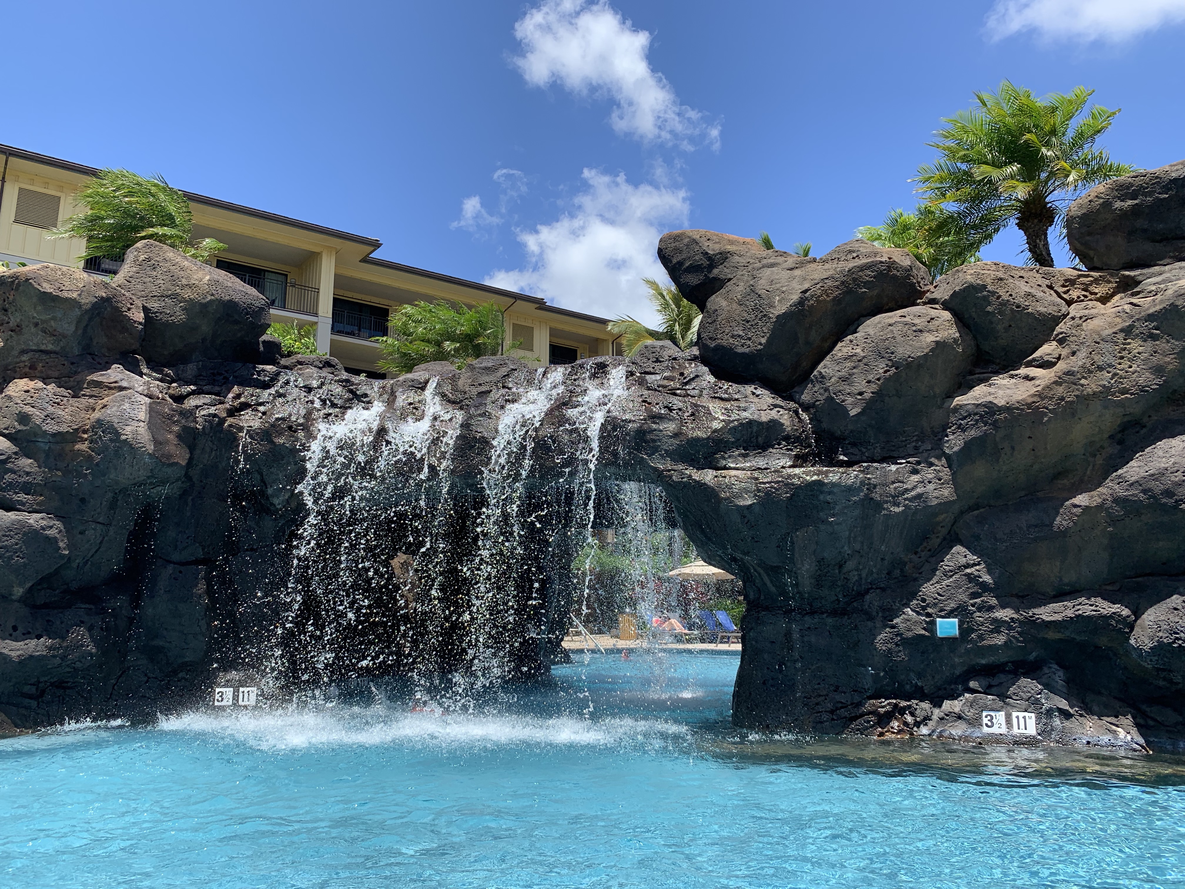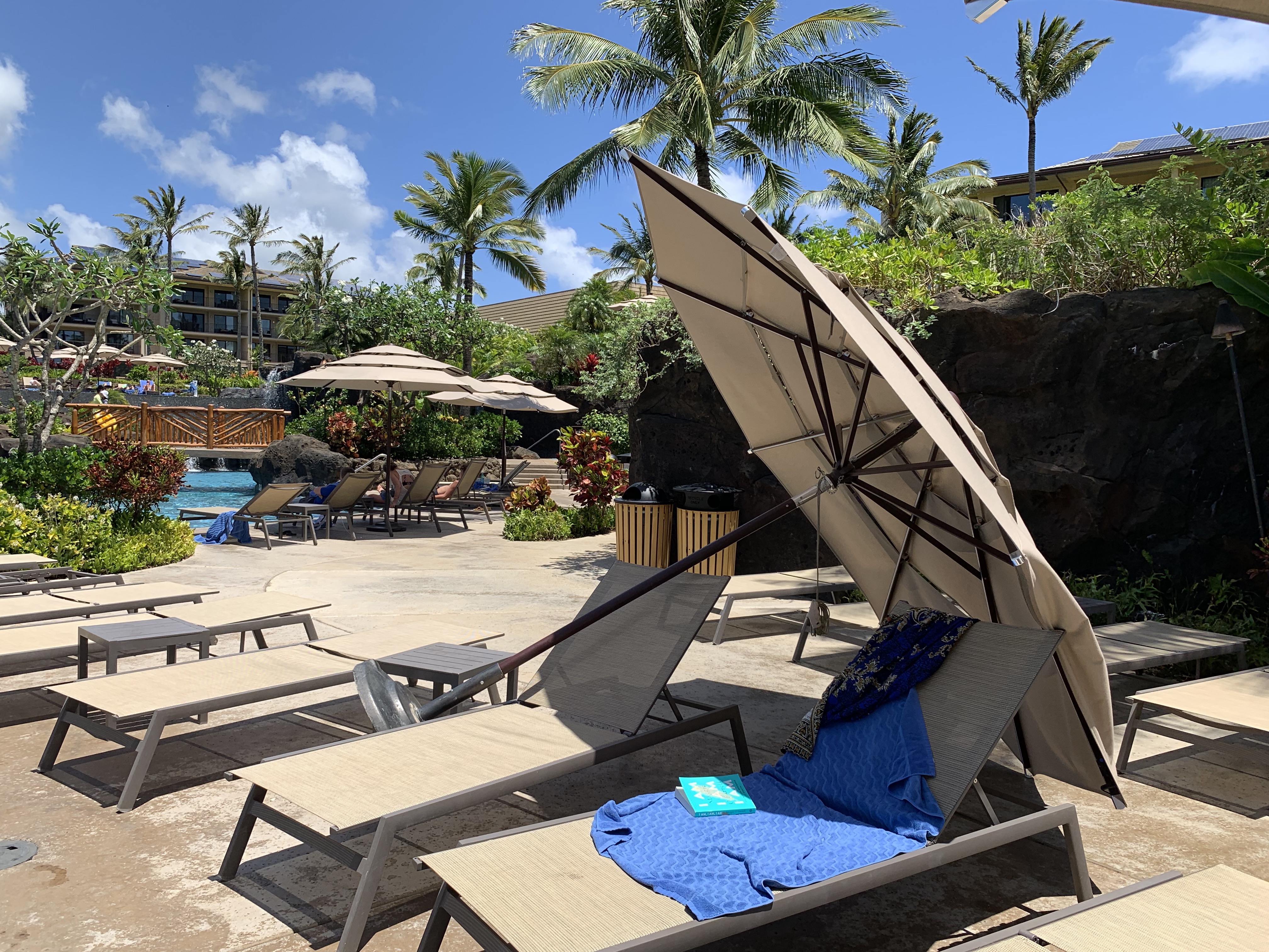 Reposed by the pool reading another’s memoir on our last day in Kauai. I reclined in the ultimate vacation position–– in a lawn chair, atop a blue beach towel, head down in the pages, and sheltered under my sunhat and dark glasses and a tan, canvas umbrella on a stand. When the chapter ended, I put the book down and looked up to take in my idyllic surroundings. The tropical pool was stunning, sun shimmering silver glitter on top of the water. Large, lava black stones were stacked to form an archway over a portion of the pool. From on top of the arch, water flowed down to form waterfalls on both sides. I heard the laughter and splashing of children. They were playing pool games together. I sighed heavy and hard. This was no longer relaxing; it was a meditation in melancholy.
